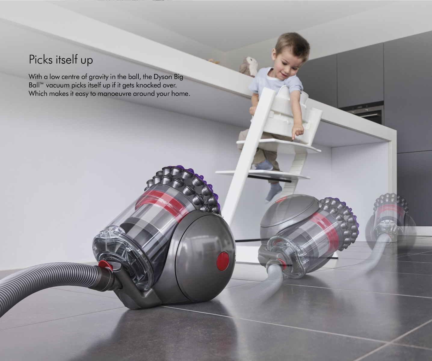Dyson Big Ball Animal 2 cylinder vacuum deep cleans the entire home with minimal effort. It self-rights when toppled and hygienically ejects the dirt from its bin, with no need to touch it. The Dyson pneumatic cleaner head self-adjusts to seal in suction on all floor types and a rotating wand handle enables effortless, versatile cleaning.